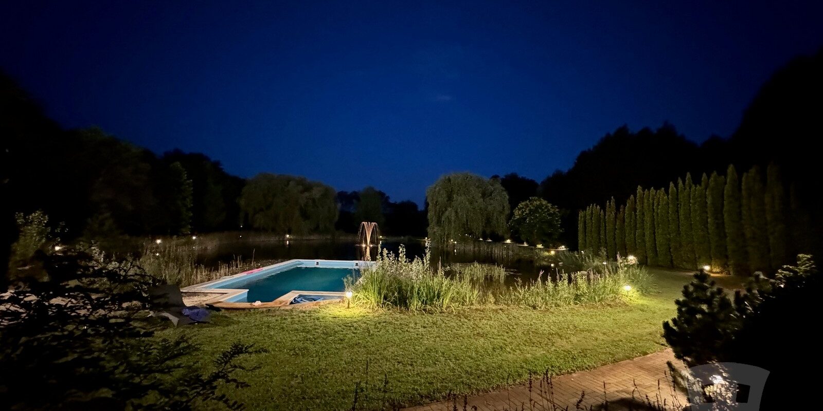 - 60 × 20 m-es kerti tó, melyben süllyesztve szabadtéri medence található